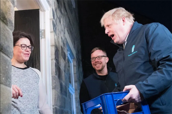 英国即将于12月12日迎来大选,为了赢取更多选票,现任首相、保守党领袖鲍里斯·约翰逊可谓使出浑身解数,前不久刚模仿完经典电影桥段,这回又当起了“搬运工”,亲自给选民送牛奶。