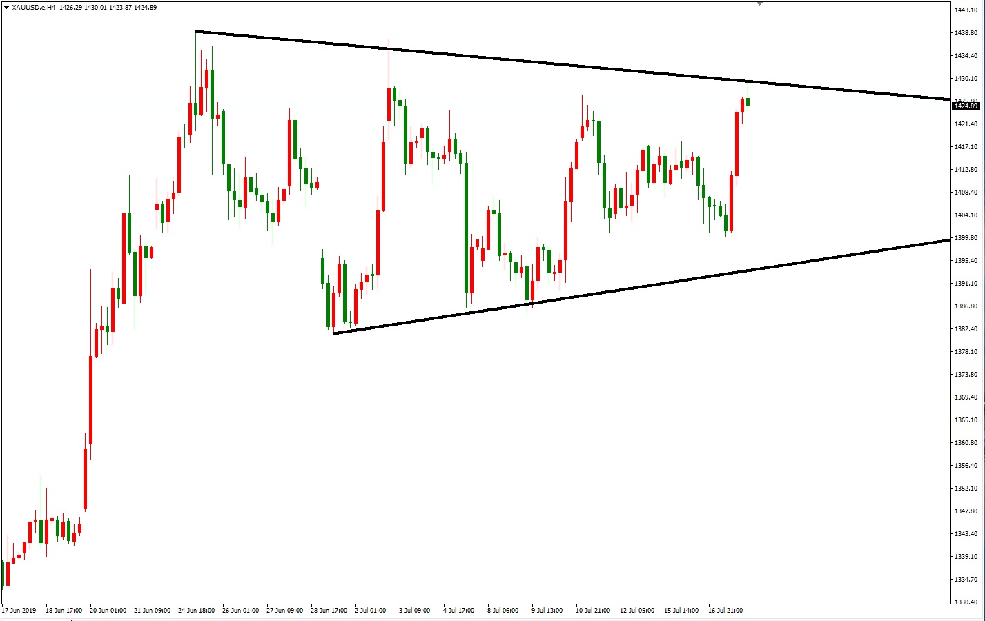 技术面上:在日线级别,黄金近期一直维持于上方高位做对称三角形震荡整理,虽然上一交易日在美国经济数据表现不佳的影响下,黄金再次暴力拉涨近25美金左右,且在日线级别再次收出大阳线实体,但目前并未改变黄金的整理结构,而小时级别长上影线的收出正好再次验证上方趋势压力线的有效性,日内交易者可轻仓尝试于1427美元/盎司附近介入黄金空单,止损1432,短周期目标参考下方1420和1410附近为主。