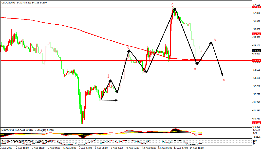 原油技术面:油价在触及57.3一线阻力后迅速回落,伴随者消息面利空的刺激,将油价冲拉回到55.8美元下方。预示本轮反弹终结,小时图至52美元附近确认反弹后,本轮上涨延伸出五浪结构,在57.3压制后,油价回落打穿了起涨点,也预示浪5终结,伴随者5浪终结将走出abc的调整浪,也就是说油价短期内进入整理下跌,上方将55.8-56作为压制点,此位置也是本轮反弹多空转化点,当前价格处于下方,我们可将55.8看做b浪的调整高低,若有效受阻,油价将走出c浪下跌,但c浪下跌幅度将超出a浪的低点,个人预计油价将测试53.4一线支撑。